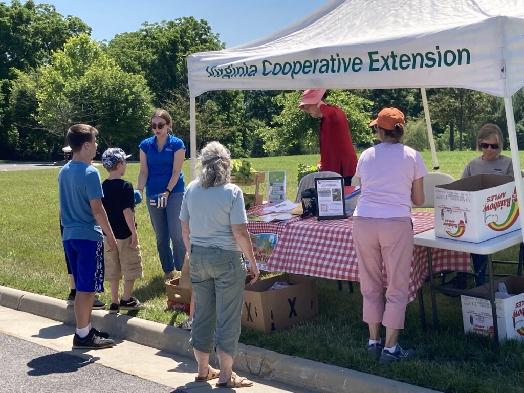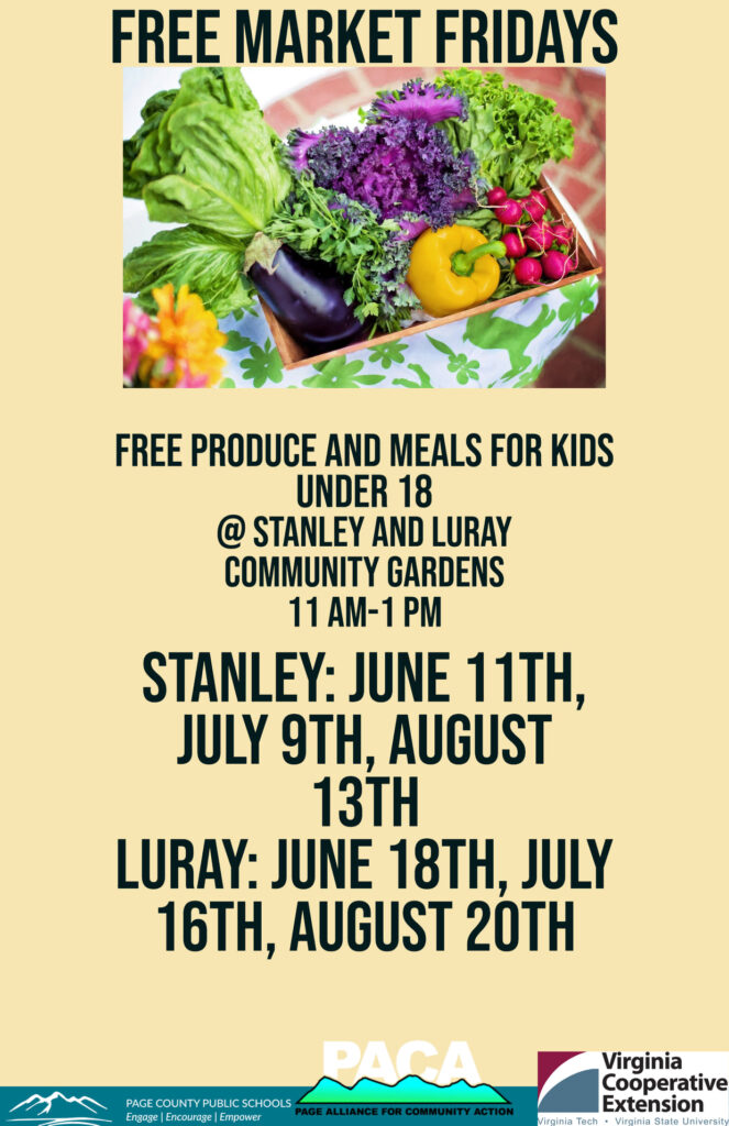 “Free Market Fridays” are being held at the community gardens in the Page County towns of Luray and Stanley through August 20. While volunteers (including ESJ member Will Daniels) worked in the Luray Garden on June 18, food and information were distributed by County Extension Agent Molly Beardslee (wearing sunglasses at left in photo below at left).