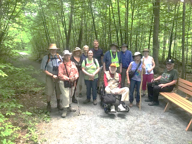 As one of many accomplishments during his long and productive career with the National Park Service, ESJ member Marc Malik had laid out and flagged the Limberlost Trail in Shenandoah National Park. On June 6, he was joined by other UU Blue Ridge members and friends on the trail. He spoke of its history and pointed out natural and geologic features along the way. Marc told us it was the first trail in the National Park system intended to be accessible for persons with disabilities, and—on this day—he traversed it in his own wheelchair, assisted by other UU members.