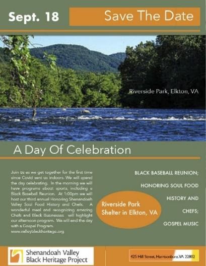 A Day of Celebration, at Riverside Park in Elkton, VA, will feature a Black Baseball Reunion, Soul Food History and Chefs, and Gospel Music
