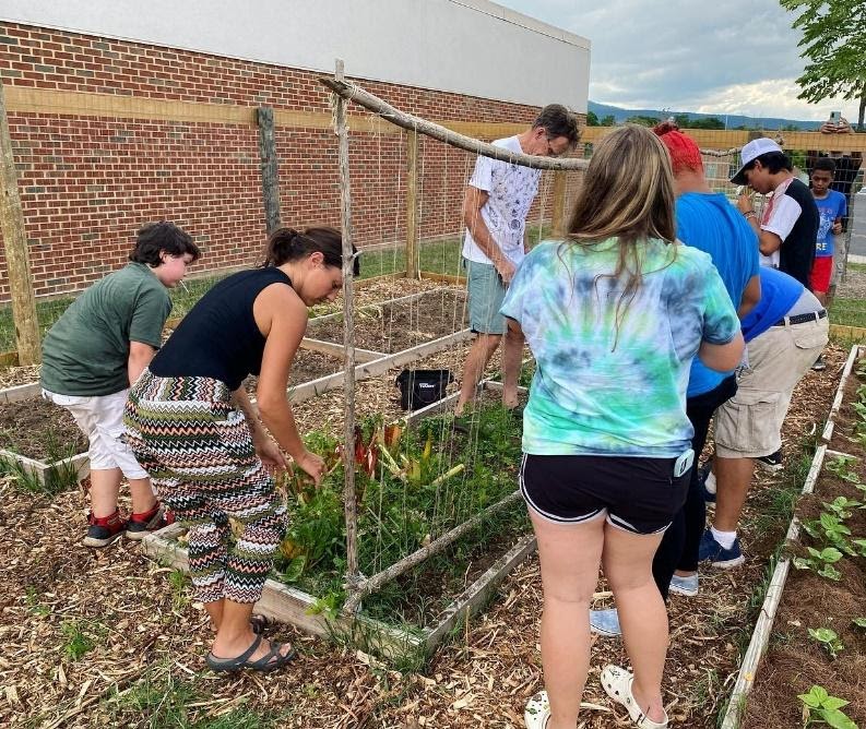 ESJ member Will Daniels with young people from The REC at the community garden in Luray (Page Alliance for Community Action photo)