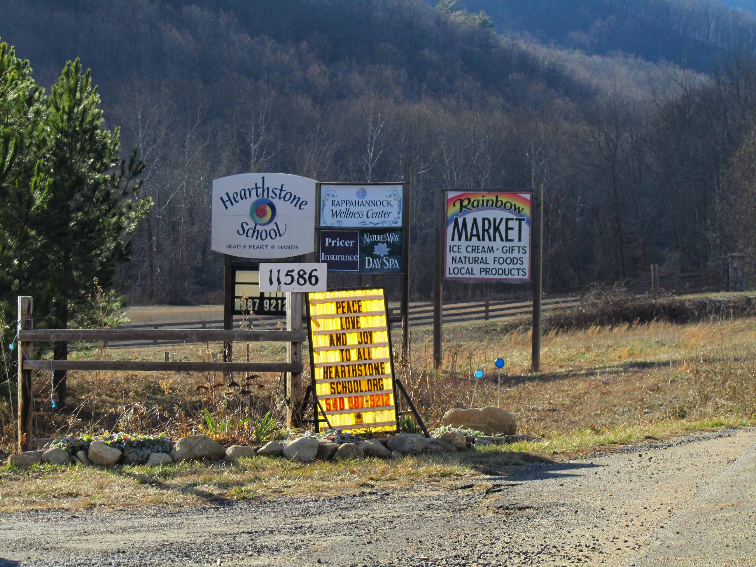 We are located at Hearthstone School, 11576 Lee Highway, Sperryville, VA. Take either driveway, before or after the signs.
